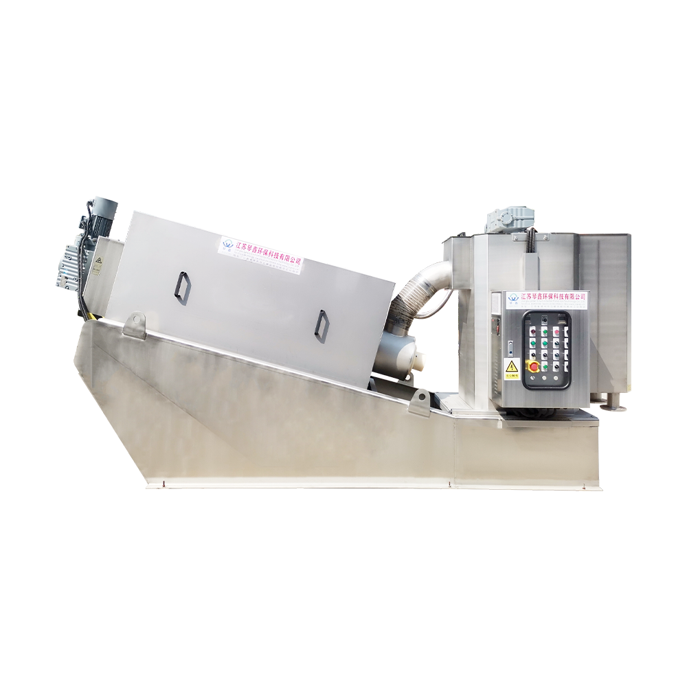 Skruepressslamavvanningsmaskinen komprimerer slammet gjennom mekanisk kraft og presser ut vannet for å oppnå effektiv dehydrering av slammet. Utstyret er utstyrt med en gradvis strammende spiralaksel for å skyve slammet til utløpet, slik at vannet i slammet raskt kan slippes ut under høyt trykk. Sammenlignet med tradisjonelle dehydreringsmetoder har skruepressen et høyere automatiseringsnivå, stor prosesseringskapasitet og kan bedre tilpasse seg ulike typer husdyravløpsvann.
